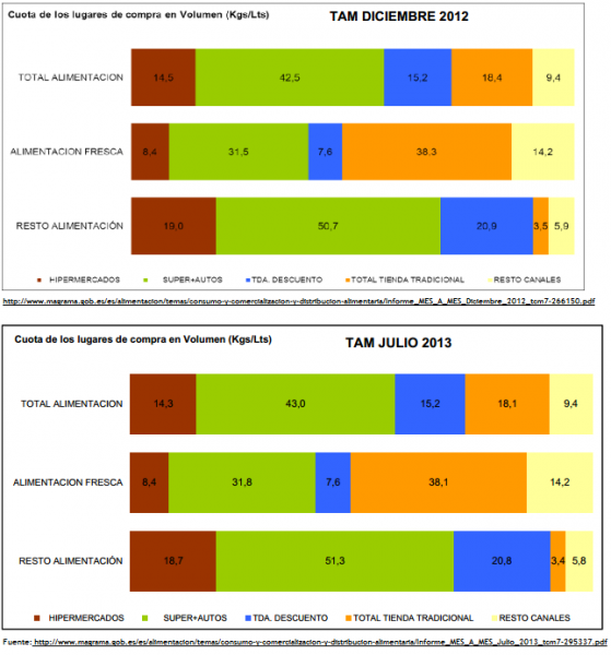 La pérdida de cuota en el tradicional sigue aumentando también durante el ejercicio de 2013, como observamos en los datos de TAM julio’2013 en comparación con el TAM dic’2012. La gran perdedora sigue siendo el hipermercado que sólo mantiene su cuota en alimentación fresca. Los grandes beneficiarios vuelven a ser los supermercados+autoservicios por las mismas razones que comentamos anteriormente y las tiendas descuento parecen congeladas en 2013.