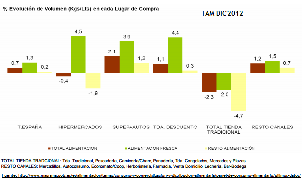 Como he comentado en otros artículos (aquí y aquí) el mercado español no crece, es más, lo más probable es que decrezca a tenor de los descensos de población que se estima se producirán en los próximos años (emigrantes que vuelven a sus países de origen y españoles que emigran por falta de expectativas laborales). Así que la capacidad de crecimiento de la superficie comercial parece tener un techo más o menos próximo, pero podría seguir creciendo en base al trasvase de superficie comercial que se pueda seguir arrancando al canal tradicional. Los mayores crecimientos deberían provenir de las líneas de alimentación fresca (refugio típico del tradicional) y las estadísticas lo vienen demostrando.