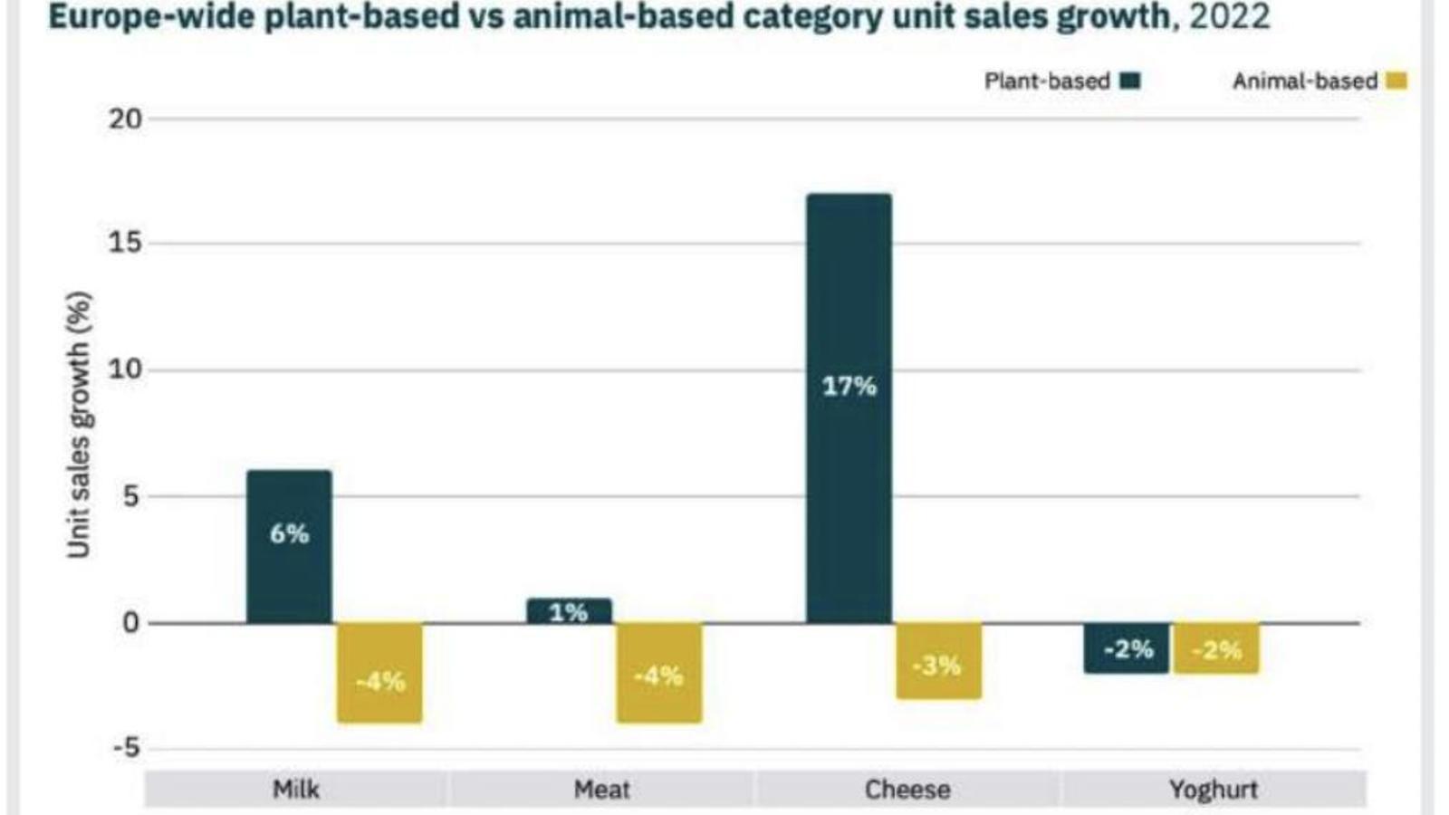 Según el informe “Perspectivas del mercado plant-based en el retail europeo. 2020-2022” (GFI-Nielsen IQ) elaborado en 13 países, las alternativas de origen vegetal a productos como la carne, el pescado o los lácteos registraron ventas por valor de 5.700 millones de euros en 2022, lo que supone un crecimiento del 6% respecto al año anterior. En total, fueron 2.700 millones de unidades las que se comercializaron a través del canal retail, una cifra el 4% superior a 2021. Estos números, siendo todavía positivos, y situándose por encima de los guarismos negativos de leche, carne, queso y yogur de origen animal, se alejan de las ratios de crecimiento del 15% del año anterior. La corrección ha sido todavía mayor en la inversión en plant-based, con una caída del 37% (1.200 millones de dólares en 2022).