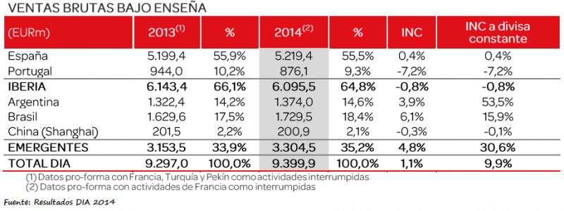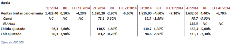 En Iberia (España y Portugal) las ventas brutas bajo enseña descendieron un 0,8%, pese a la aportación de Schlecker / Clarel (316,1 millones de euros) y El Árbol (133,5 millones de euros). A superficie comparable - LFL - el negocio estuvo decreciendo en todos los trimestres del 2014, cerrando el ejercicio con un descenso del 5,9% (-3,3% en 2013 y +0,2% en 2012).