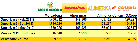 Y en todo esto lo que subyace es el enorme diferencial (+600pb.) existente entre los costes de proceso de Mercadona (22,18%) y el resto de la distribución alimentaria dedicada a la explotación de supermercados propios (media 28,5%):