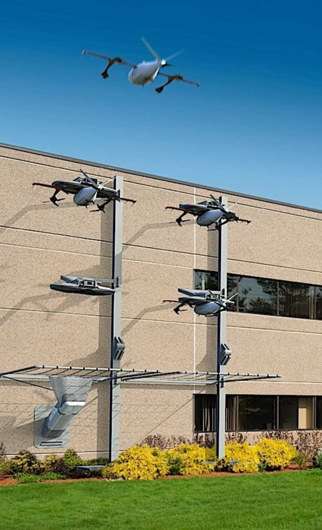 La nueva plataforma diseñada cuenta con una estación de energía totalmente inalámbrica donde los drones se acoplan por su parte superior para recargar, mientras el droide desciende por un conducto deslizante para recoger su siguiente envío.