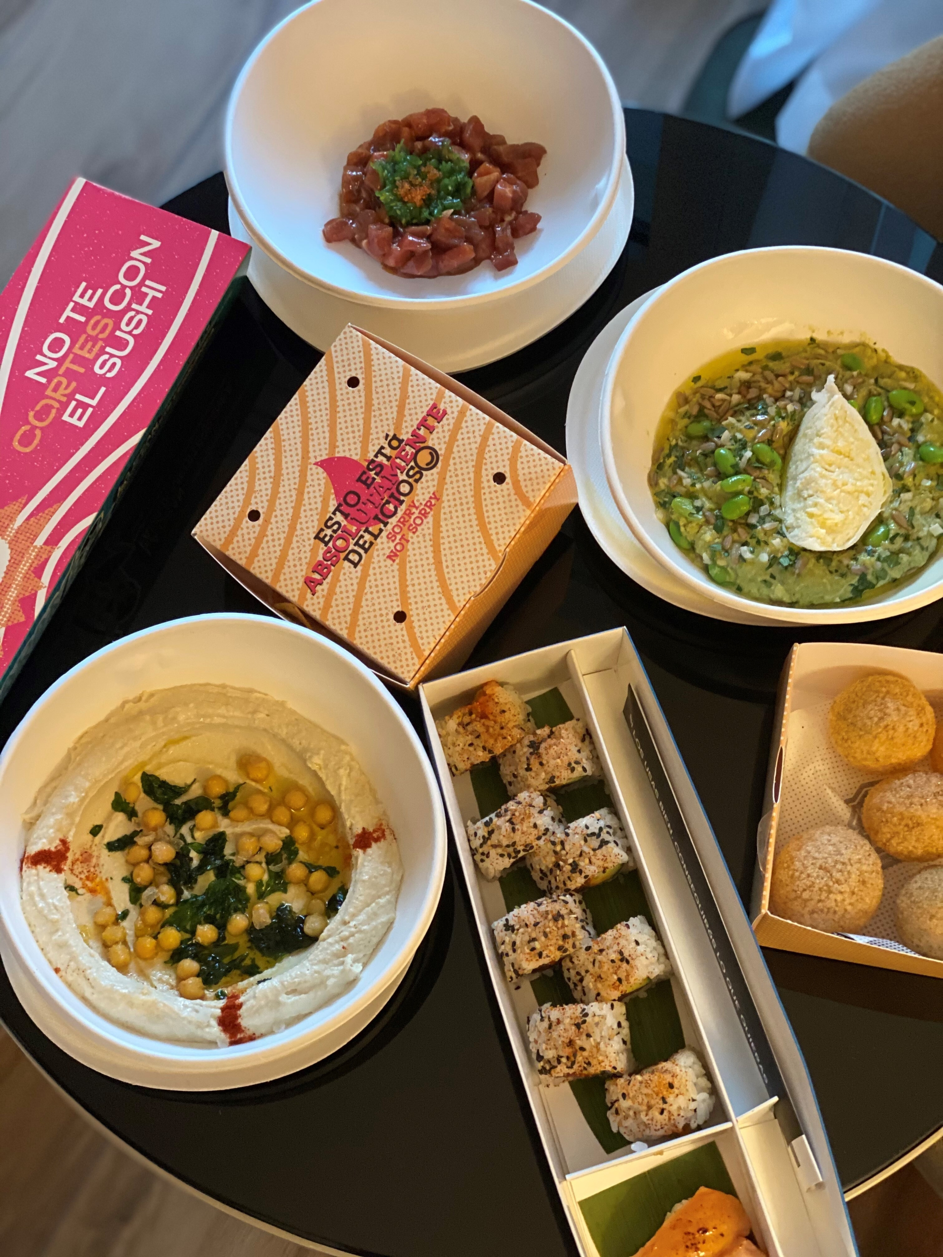 brioche de rabo de toro con salsa Bull, así como sus gyozas y una de sus pizzas. Y en Marbella nos dimos al sushi, degustamos también su tartar de atún (otro de mis favoritos en el restaurante BIBO del mismo chef) y lo complementamos con hummus y edamames. Es sorprendente cómo la calidad de la oferta y los productos es muy similar en una ciudad u otra, cosa que no ocurre tampoco con otros servicios de delivery.