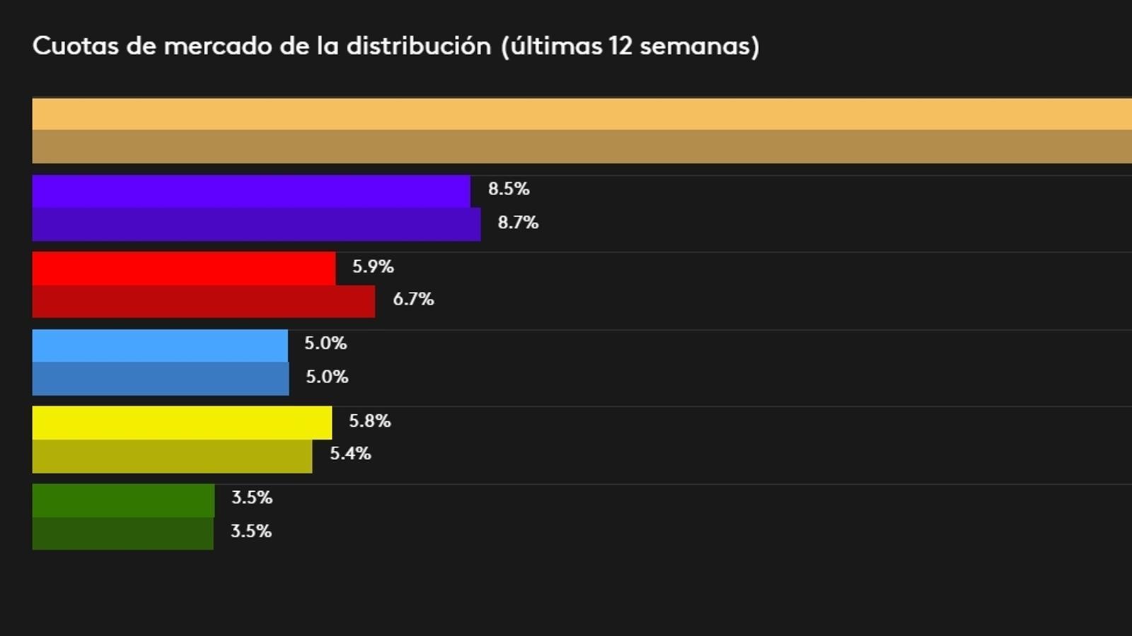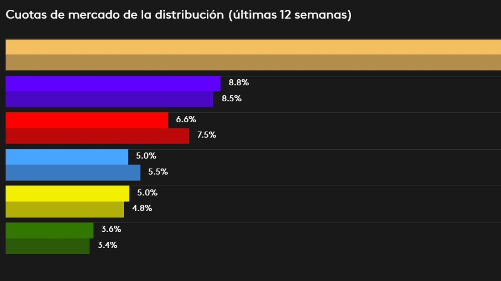 Comparando los datos con los del mismo período anterior (mayo 18 / febrero 19), vemos en el cuadro de abajo (y si no lo ves bien yo te lo explico), que un año antes Carrefour había subido tres décimas porcentuales (del 8,5% al 8,8%), unos resultados mejores que los del resto: Lidl y Auchan (+0,2%), Mercadona (-0,3%), Eroski (-0,5%) y Dia (-0,9%).