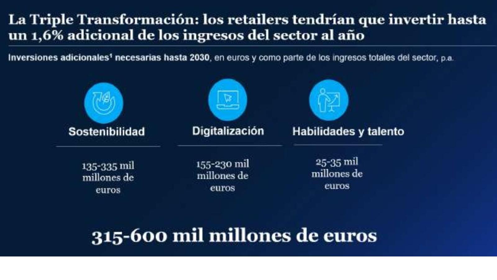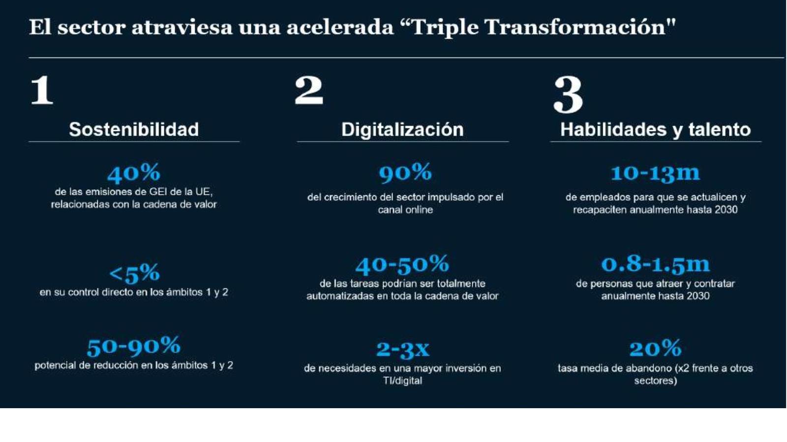 El retail afronta un inmenso reto de triple transformación que requerirá de una inversión de hasta 600.000 millones de euros hasta 2030 en Europa para salvaguardar el futuro del sector. La sostenibilidad, la digitalización y el talento son las tres palancas de una oportunidad única para generar un crecimiento más rápido, más ecológico y más productivo.