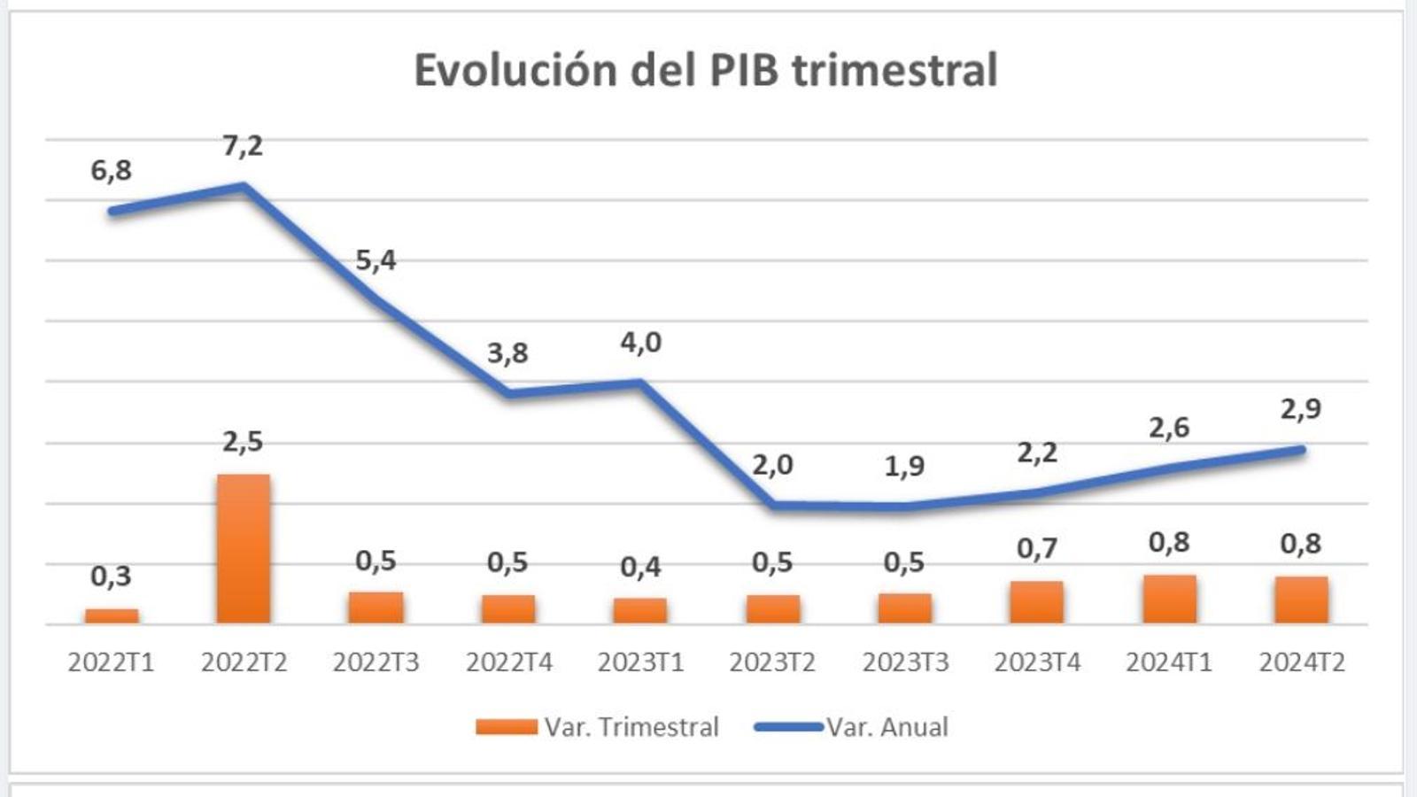 En primer lugar, el crecimiento del PIB 2T2024 repite el 0,8% en tasa intertrimestral lo que lleva la tasa interanual al 2,9%, tres décimas más que el trimestre anterior; se trata de un avance que será revisado en dos meses, pero el INE siempre revisa los datos de PIB al alza últimamente.