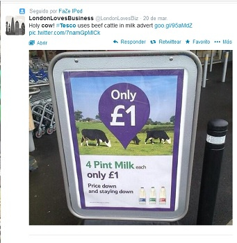 Tengo una vaca lechera, versión Tesco (ver aquí). Si anuncias la bajada del precio de leche con una publicidad protagonizada por una vaca de carne sólo consigues cabrear a los granjeros, ser objeto de sorna en las redes sociales e incrementar de forma absurda los costes al tener que corregir la campaña comercial.