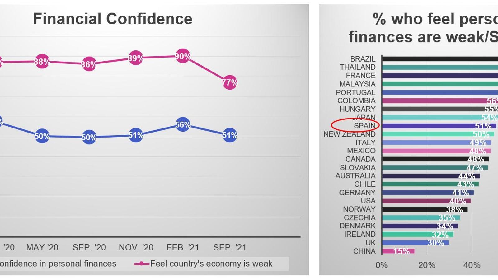 Datos España : A pesar de la mejora, todavía casi 4/5 de los consumidores siguen pensando que la economía de su país es débil. La preocupación por las finanzas personales continúa en la mitad de la población, lo que significa que todavía existe una gran incertidumbre económica(6).