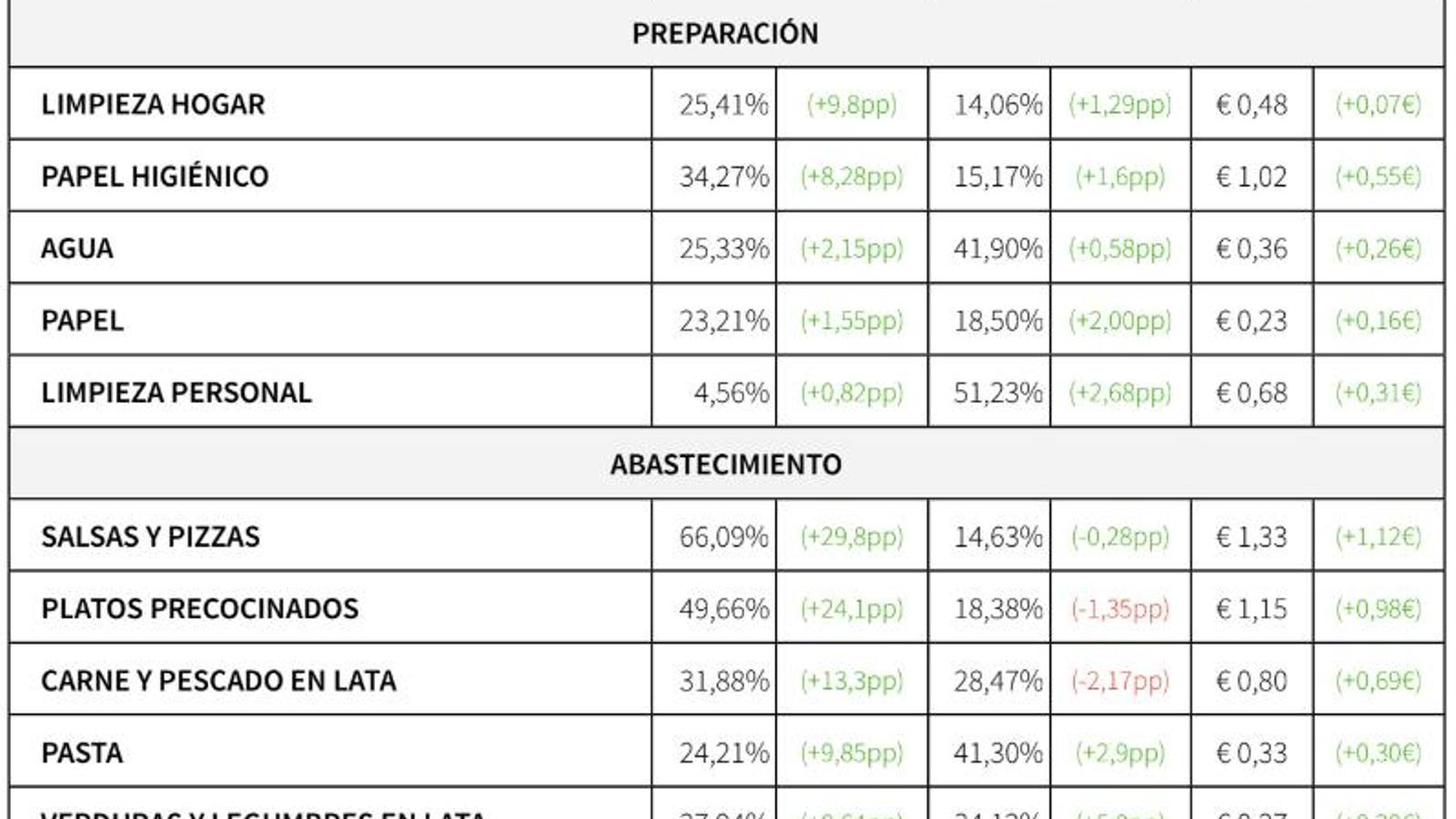 Durante las etapas distinguidas anteriormente, y a pesar de la excepcionalidad, fueron varias las categorías que destacaron por beneficiarse de un crecimiento significativo de esta métrica tal y como se muestra en la siguiente tabla. La pasta alcanzó el 1.000% de crecimiento en este índice, las salsas y pizzas preparadas llegaron al 533%, el 575% en comida precocinada y más del 100% en papel higiénico.