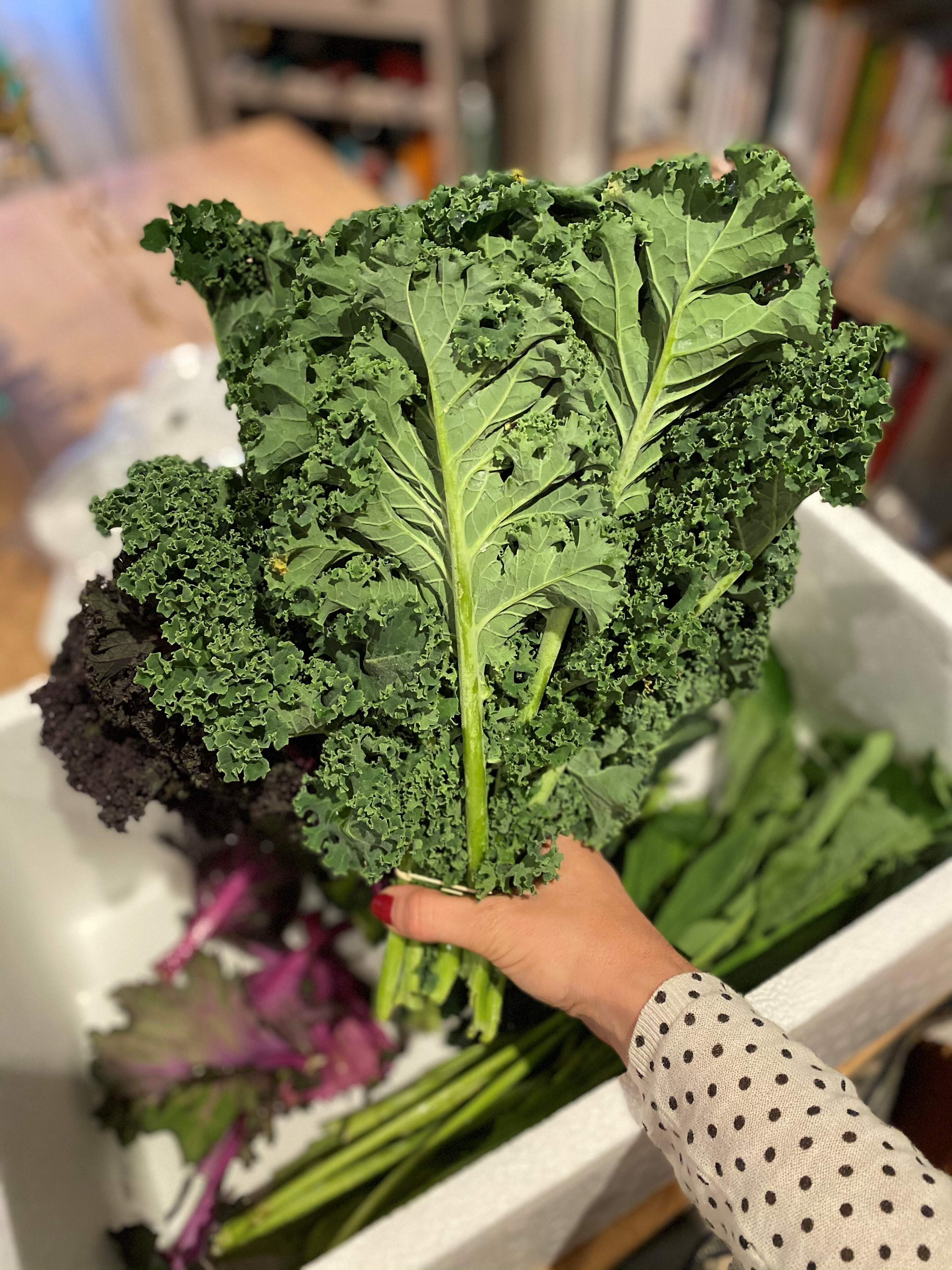 La caja incluía unos manojos de berza rizada, una verde y otra roja, difícil de encontrar en Madrid. Diría que es el padre del kale, repleta de nutrientes y perfecta para caldos. Esta especie la llaman berza pulpo de tierra, una especie autóctona recuperada en colaboración con el CSIC. También pedí un manojo de berza para freír (la kale toscana) con la que me encanta hacer chips vegetales al horno (les echas un pelín de aceite, sal y pimienta y a horno 10 minutos).