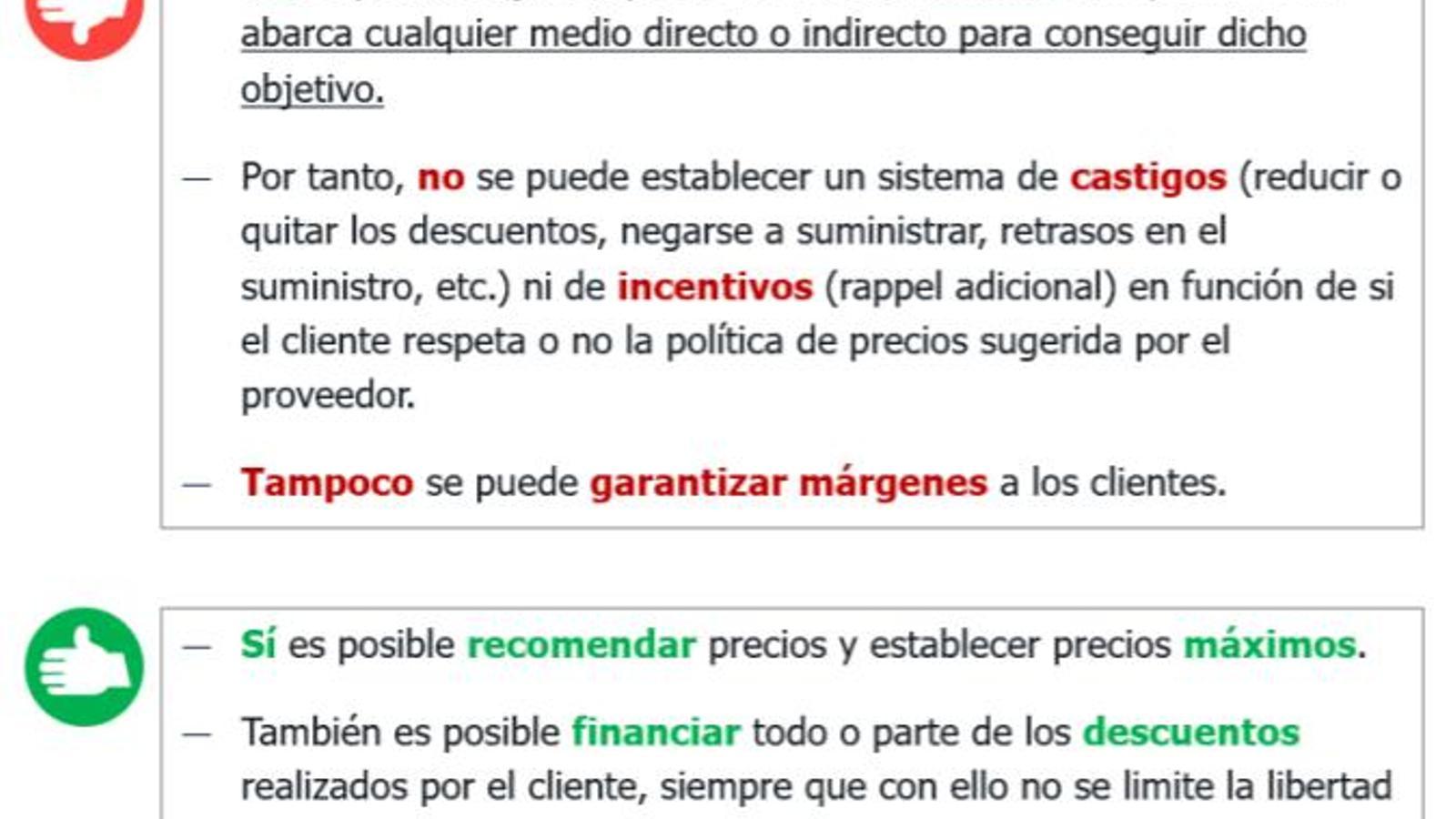 Por supuesto, deben evitar cualquier conducta que, de manera directa o indirecta, pueda comprometer la independencia de sus distribuidores a la hora de reducir los precios de sus productos.