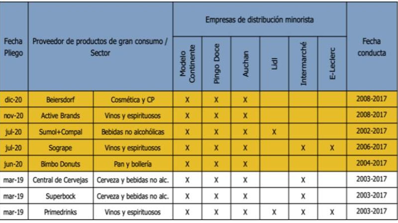 Como se muestra en el siguiente cuadro, hasta ahora conocíamos la existencia de 8 expedientes. Quedan por tanto por resolver los casos de Superbock, Bombo Donuts, Sogrape, Sumol+Compal, Active Brands y Beiersdorf.