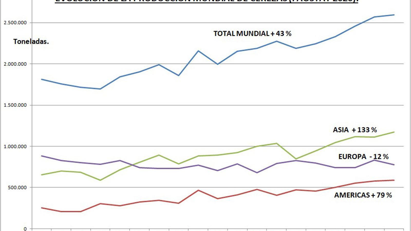 Los datos que nos proporciona la FAO sobre la cosecha de cerezas de los diferentes continentes ya muestra de entrada una evolución muy diferente entre ellos, en tan solo los primero 20 años del actual siglo.