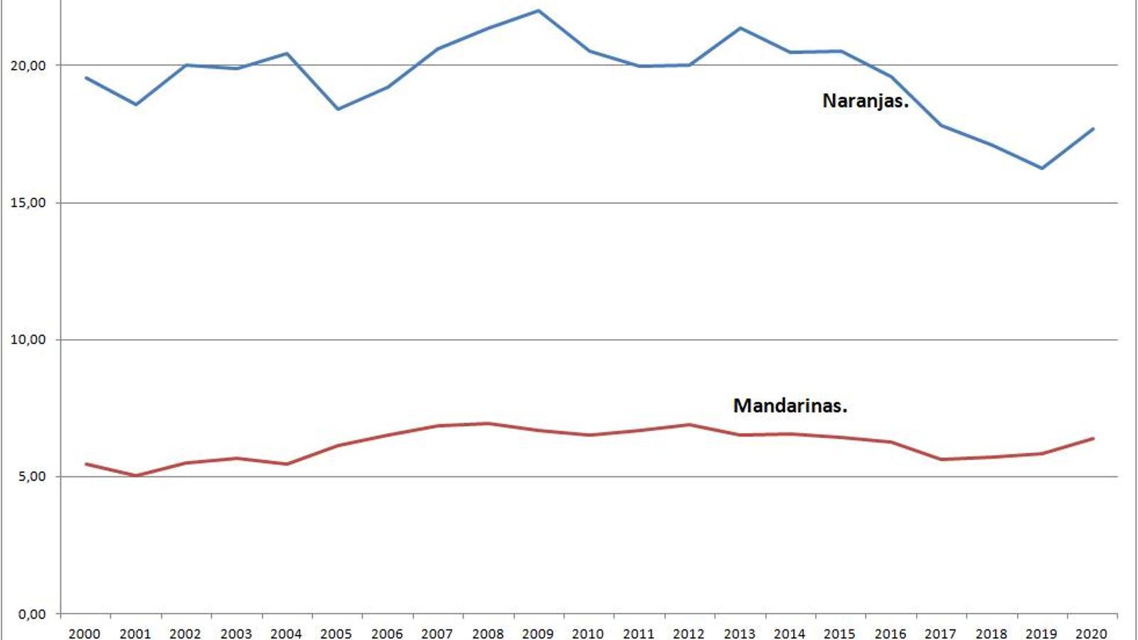 Según los datos del Ministerio de Agricultura sobre el consumo en los hogares, las naranjas y mandarinas gozaron de una tendencia ascendente hasta finales de la primera década del actual siglo. A partir de ese momento las mandarinas fueron bajando poco a poco, pero la bajada de las naranjas fue enorme. De 21,36 Kg. en 2013 a 16,26 en 2019. Llegó la pandemia y, empujado por ella, se produjo una fuerte recuperación, sobre todo durante los meses de marzo, abril y mayo, la cual provocó un pequeño repunte que nos llevó a los 17,68 Kg/cápita.