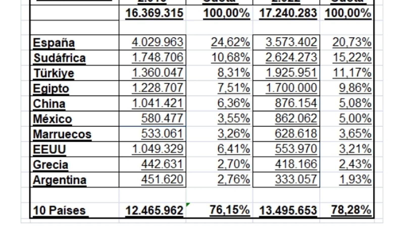 Se observa en primer lugar que estos mismos diez países suponen tanto en 2013 como en 2022 el 77% del total de la exportación mundial. Sin embargo hay cambios significativos en el periodo. Los cuatro primeros países no han cambiado de posición, pero España ha bajado algo más de 500.000 Tm, y su cuota ha pasado de un 24,62 a un 20,73 %. Sudáfrica ha crecido cerca de 900.000 Tm y tiene una cuota del 15%. Turquía y Egipto, los dos países competencia directa de España en el Mediterráneo, juntos pasan de 2.500.000 Tm a 3.600.000 Tm y superan a España.