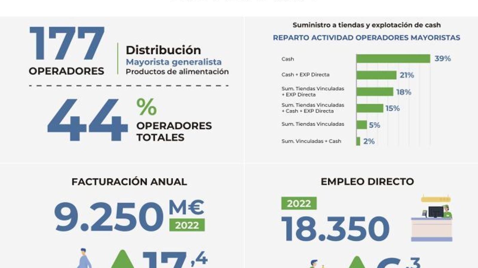 En España existen 177 empresas operadoras de cash&carry, suministradoras de todo el surtido que necesita un negocio de alimentación minorista o de hostelería, y de ellas 106 obtienen la mayor parte de sus ingresos de la actividad mayorista, arrojando una facturación conjunta en 2022 que superó los 9.250 millones de euros (frente a los 8.000 millones alcanzados en 2021) y que "es muy probable que en 2023 superen por fin la barrera de los 10.000 millones de euros".