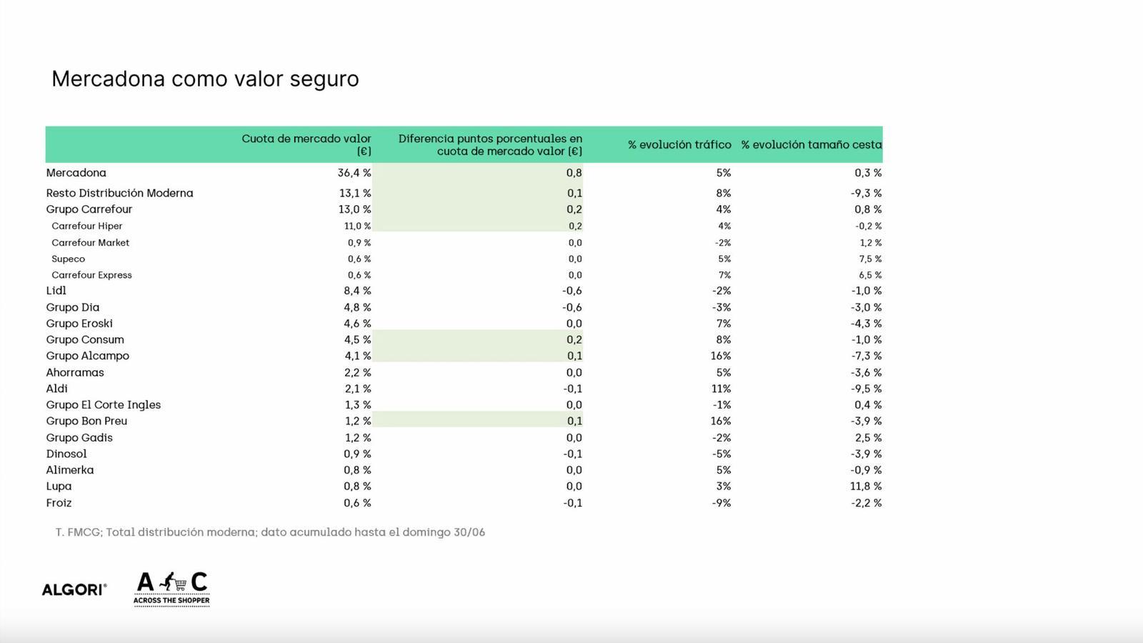 Consum, en sexta posición, avanza dos décimas hasta el 4,5%, gracias a un considerable incremento del tráfico (+8%) y a un modesto descenso en el tamaño de la cesta (-1%).