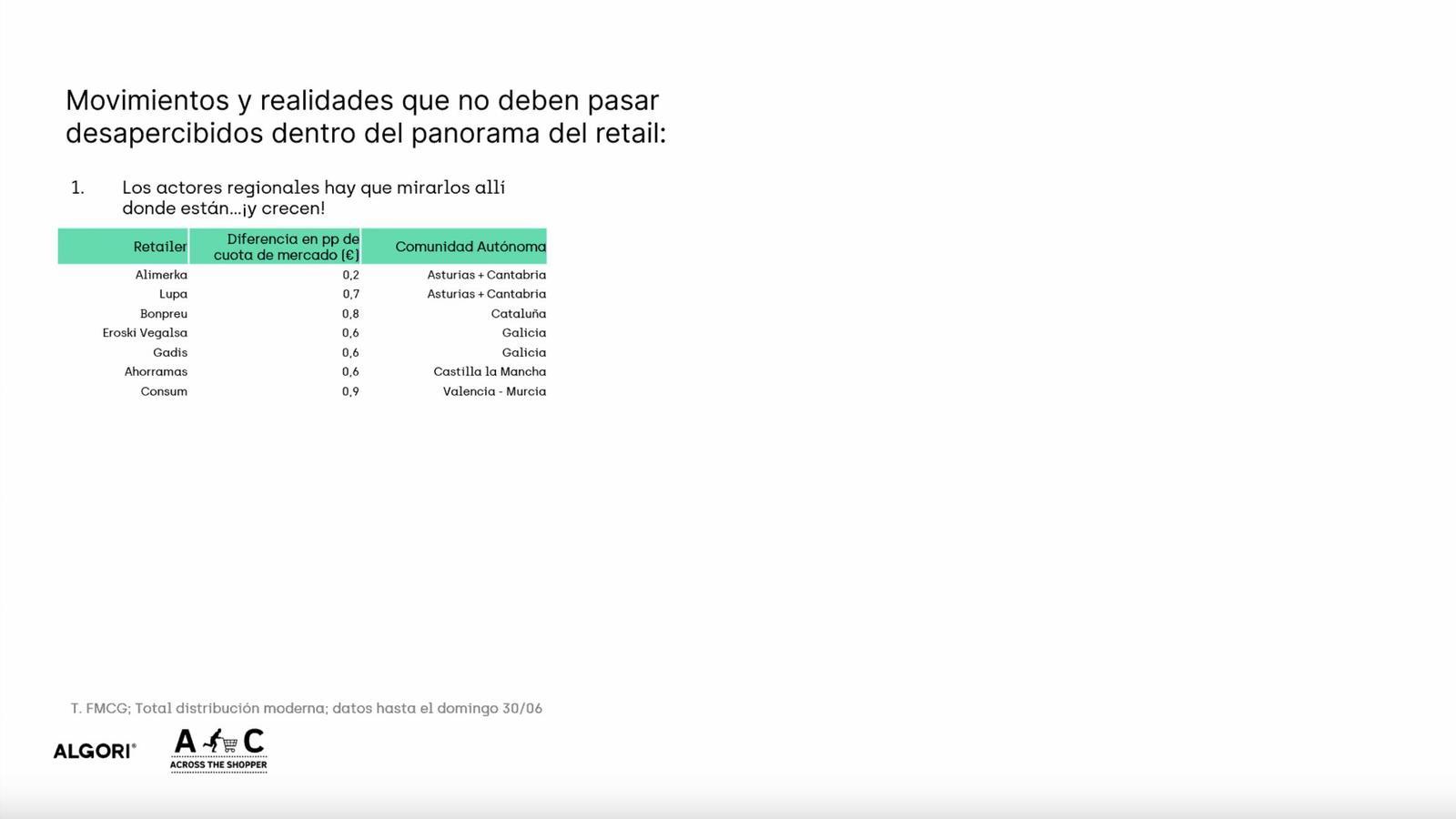 Así lo refleja el estudio de Algori: Alimerka y Lupa avanzan dos y siete décimas respectivamente en Asturias y Cantabria; Bonpreu, ocho décimas en Cataluña; Vegalsa-Eroski y Gadis, seis décimas cada una en Galicia; Ahorramas, también seis décimas en Castilla-La Mancha; y Consum, que, disfruta de una sólida sexta posición en el ámbito nacional, ha crecido casi un punto (+0,9%) en Comunidad Valenciana y Murcia, el espacio natural de Mercadona.