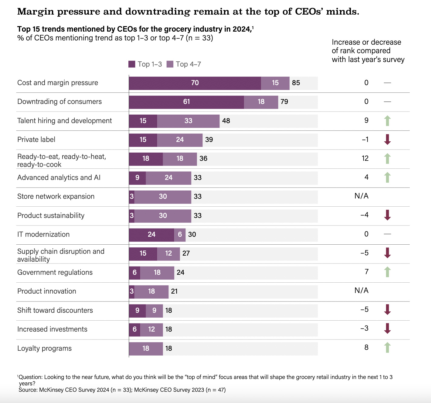 Entre las principales preocupaciones de los CEOs, se encuentran: la presión sobre los márgenes, el 'downtrading' de los consumidores, la contratación de talento, la marca blanca y los productos de comida preparada y para llevar. Por detrás se encuentran cuestiones como la inteligencia artificial, la expansión de tiendas, la sostenibilidad o la modernización informática, entre otras.