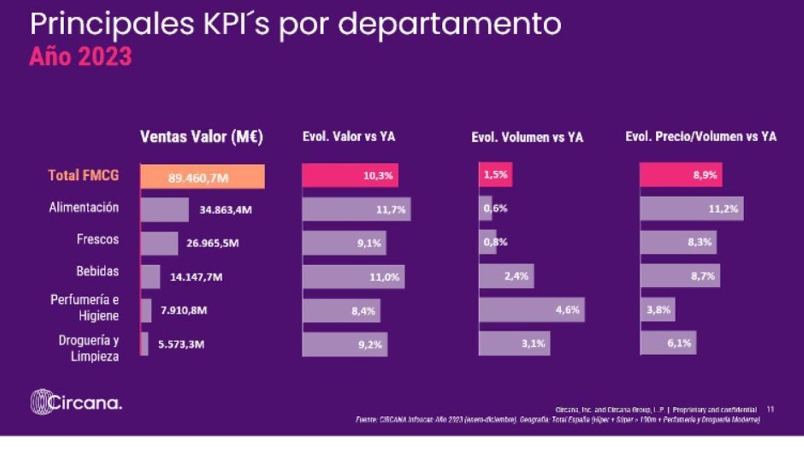 El departamento de Alimentación, que es el que representa un mayor porcentaje de gasto para las familias españolas, sigue registrando el mayor incremento en precios (+11,7%) aunque experimenta un aumento en consumo (+0,6%) respecto de 2022, continuando la línea de la mejoría registrada respecto de los datos registrados en los meses anteriores.