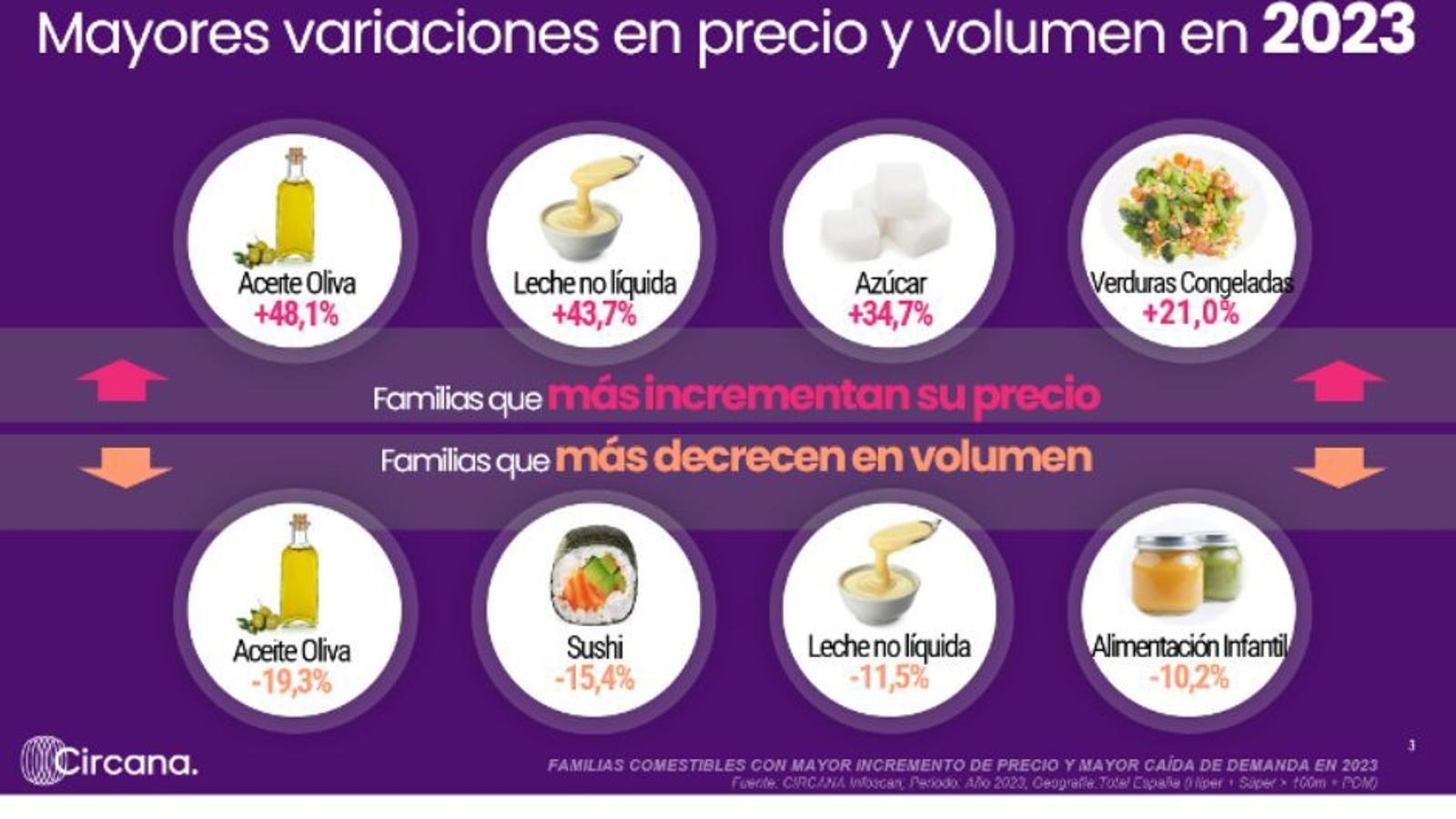 En cuanto a volumen, las familias que más decrecen son: Aceite de Oliva (-19,3%), Sushi (-15,4%), Leche no líquida (-11,5%) y Alimentación infantil (-10,2%).