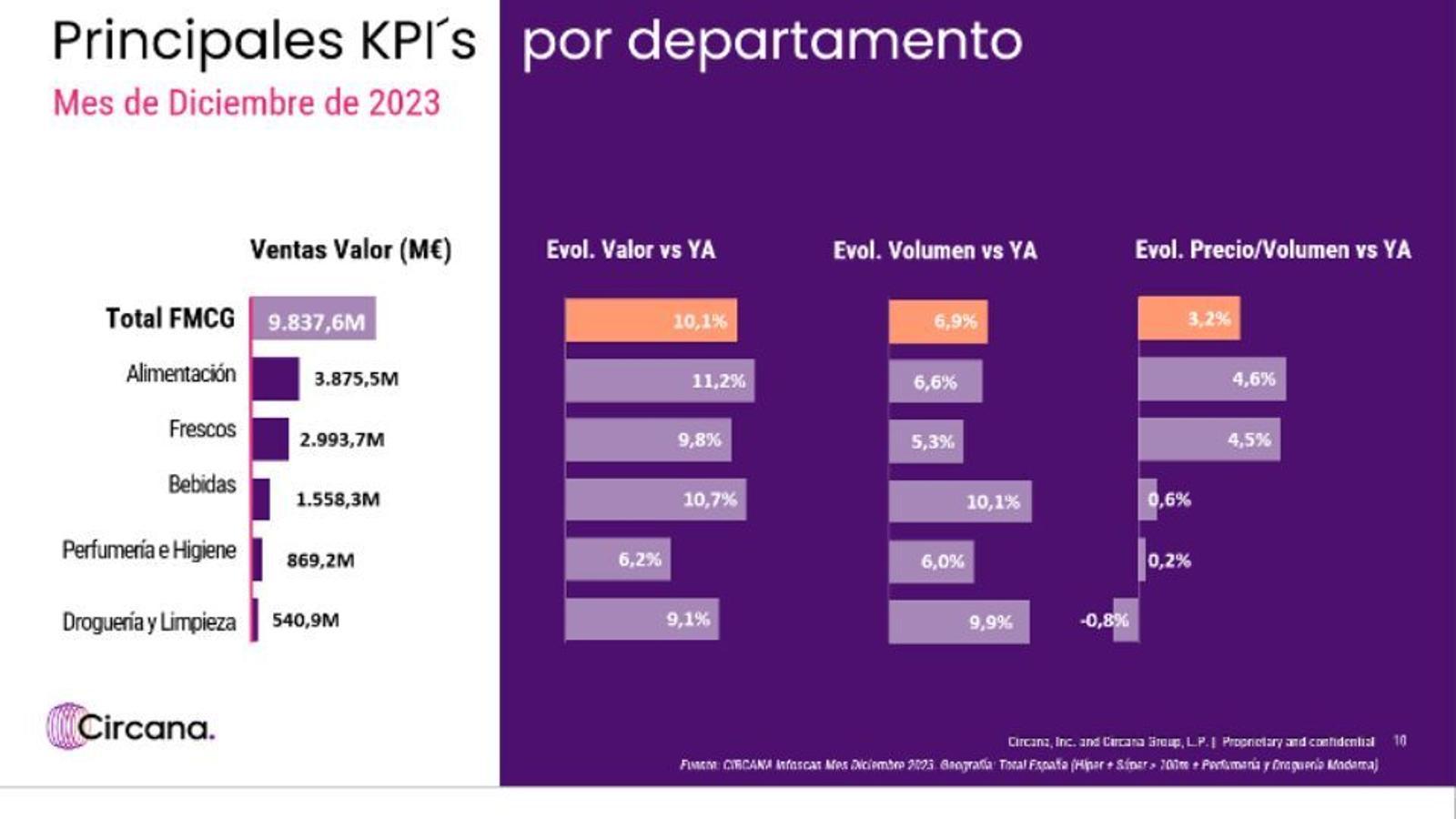 Así lo refleja el último barómetro de Circana, correspondiente al mes de diciembre de 2023, que muestra la evolución de los principales indicadores de gran consumo en España.