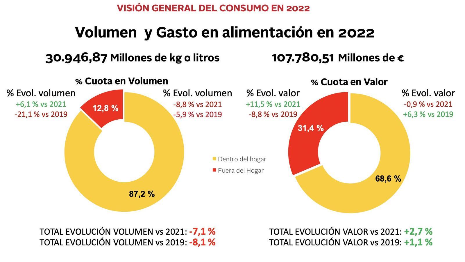 En términos generales, los consumidores pagan más y consumen menos alimentos. El consumo en el hogar, que asciende a 26.986 millones de kilos o litros, se ha reducido el 8,8% en volumen y el 0,9% en valor en relación a 2021.