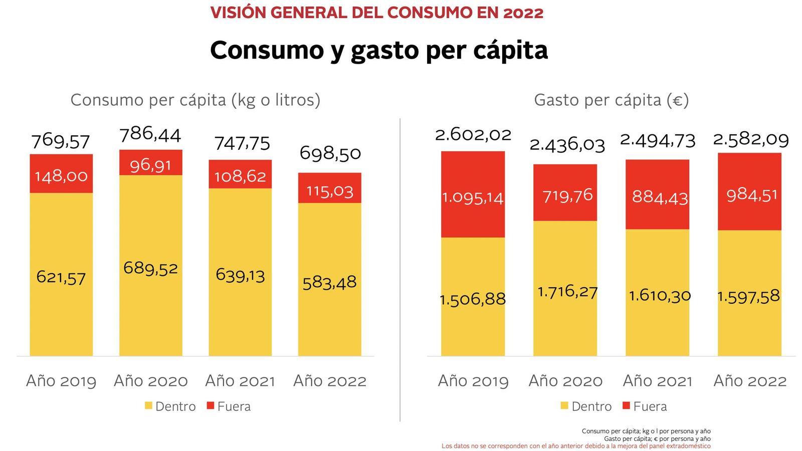 En relación al periodo anterior a la pandemia, el consumo en volumen es todavía inferior: en 2022 era de 115,05 kg o litros por persona, frente a los 148,00 kg o litros por persona de 2019. Asimismo, el consumo en gasto fuera del hogar también se encuentra por debajo de los niveles prepandemia: en 2019 era de 1095,14 euros per cápita y en 2022 es sólo de 984,51.