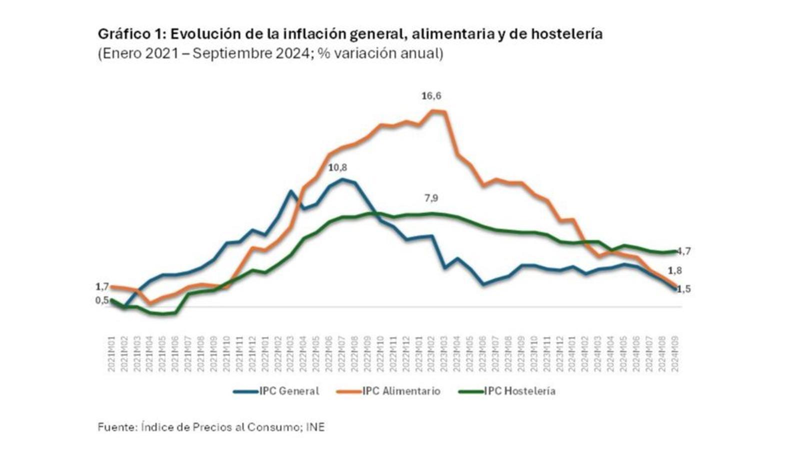 En estos momentos el único grupo que presenta una mayor resistencia a la baja es la inflación de los servicios, y así, a modo de ejemplo, vemos que el IPC de Hostelería se mantuvo en septiembre de 2024 en el 4,7%, claramente por encima del índice general.