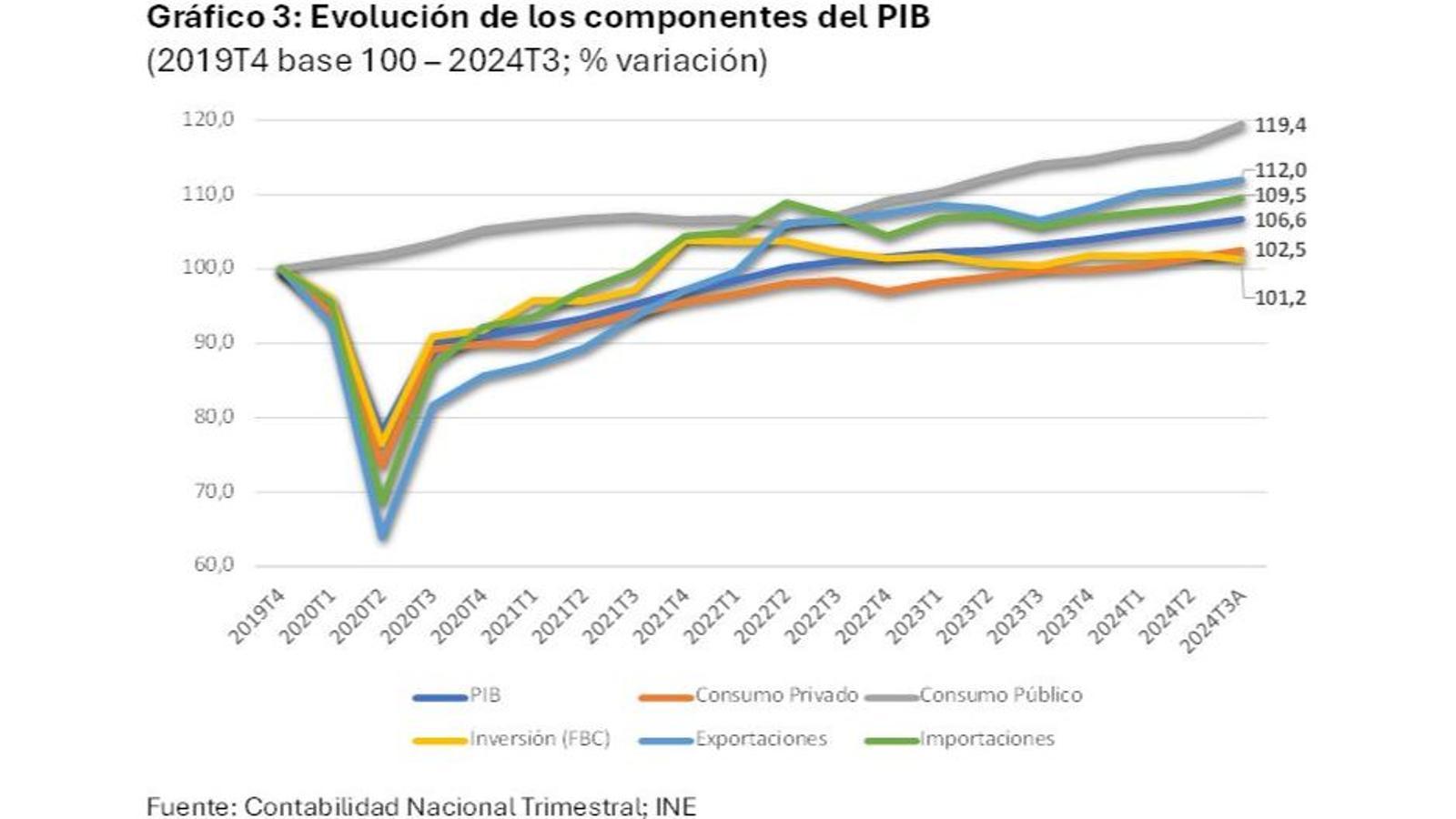 Por poner esta tasa de crecimiento en perspectiva, la Unión Europea experimentó un crecimiento del 0,3% trimestral en 2024T3 y el área euro del 0,4%, con Francia creciendo al 0,4%, Alemania al 0,2% e Italia al 0,0%. Es decir, España está creciendo a un ritmo del doble respecto de los países de su entorno.