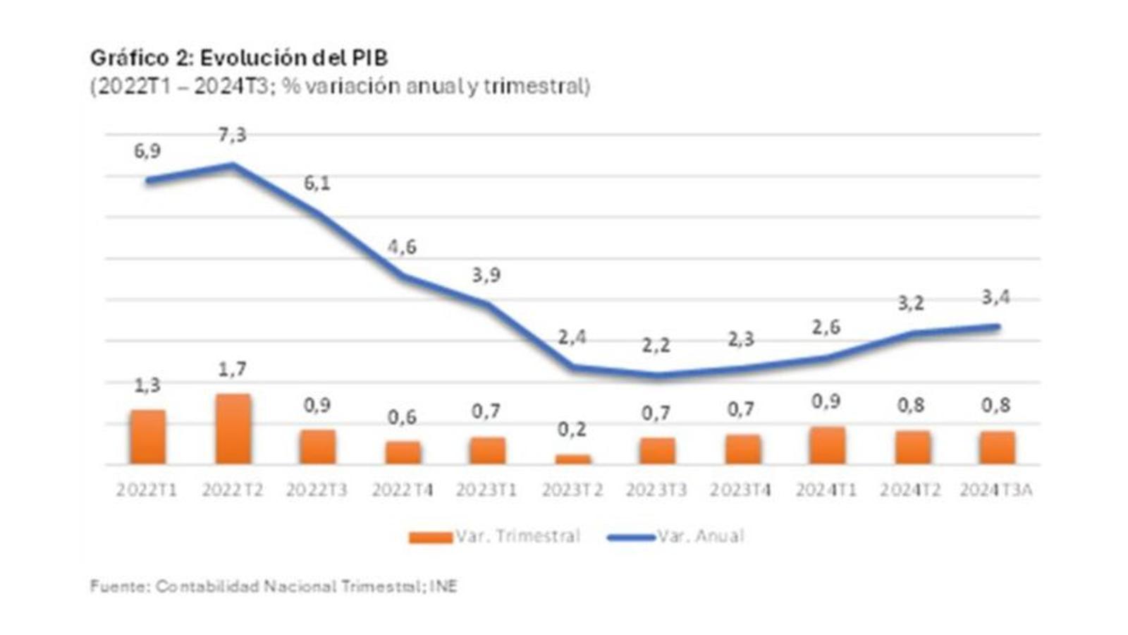 Sin embargo, el PIB de España no solo no ha entrado en recesión, sino que muestra una clara senda de aceleración a lo largo de 2024. El último dato disponible de Contabilidad Nacional, correspondiente al tercer trimestre de 2024, muestra una tasa de variación trimestral del PIB del 0,8%, que lleva el crecimiento interanual al 3,4% (Gráfico 2), una tasa de crecimiento más propia de un periodo de expansión.