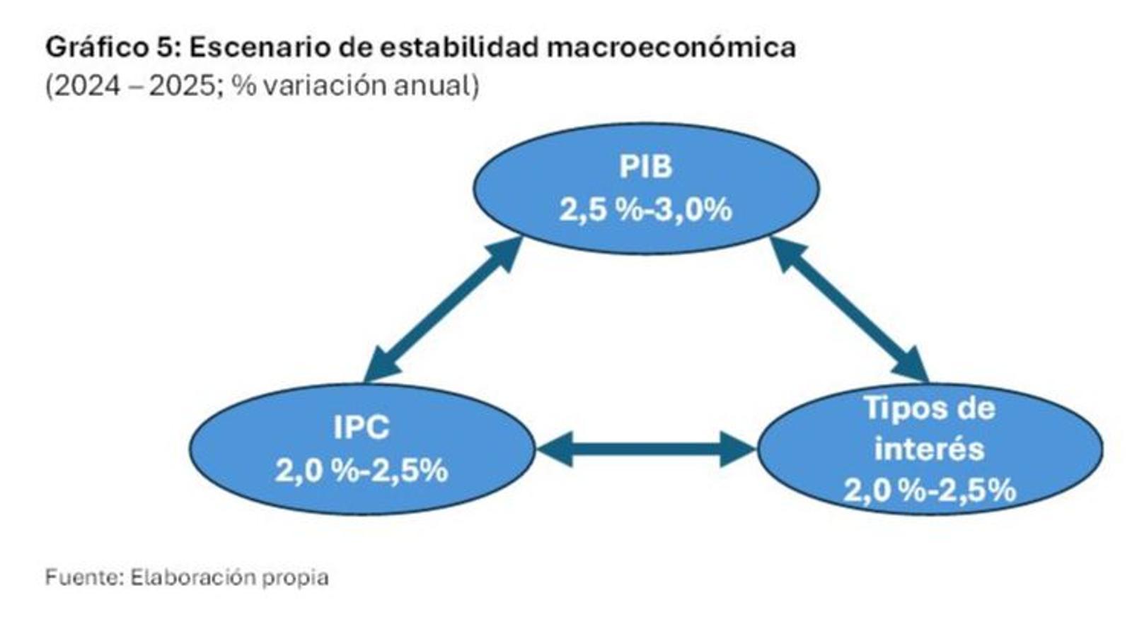 En resumen, y a la vista de los datos de coyuntura económica más recientes, podemos afirmar que el escenario de “aterrizaje suave hacia la estabilidad macroeconómica” con los tres parámetros clave de coyuntura -PIB, IPC y tipos de interés- moviéndose entre el 2,0% y el 3,0% es ahora mismo el más probable para el conjunto de 2024 y 2025. Este escenario no está exento de riesgos, fundamentalmente geopolíticos, que podrían obligar a revisar las perspectivas macroeconómicas.