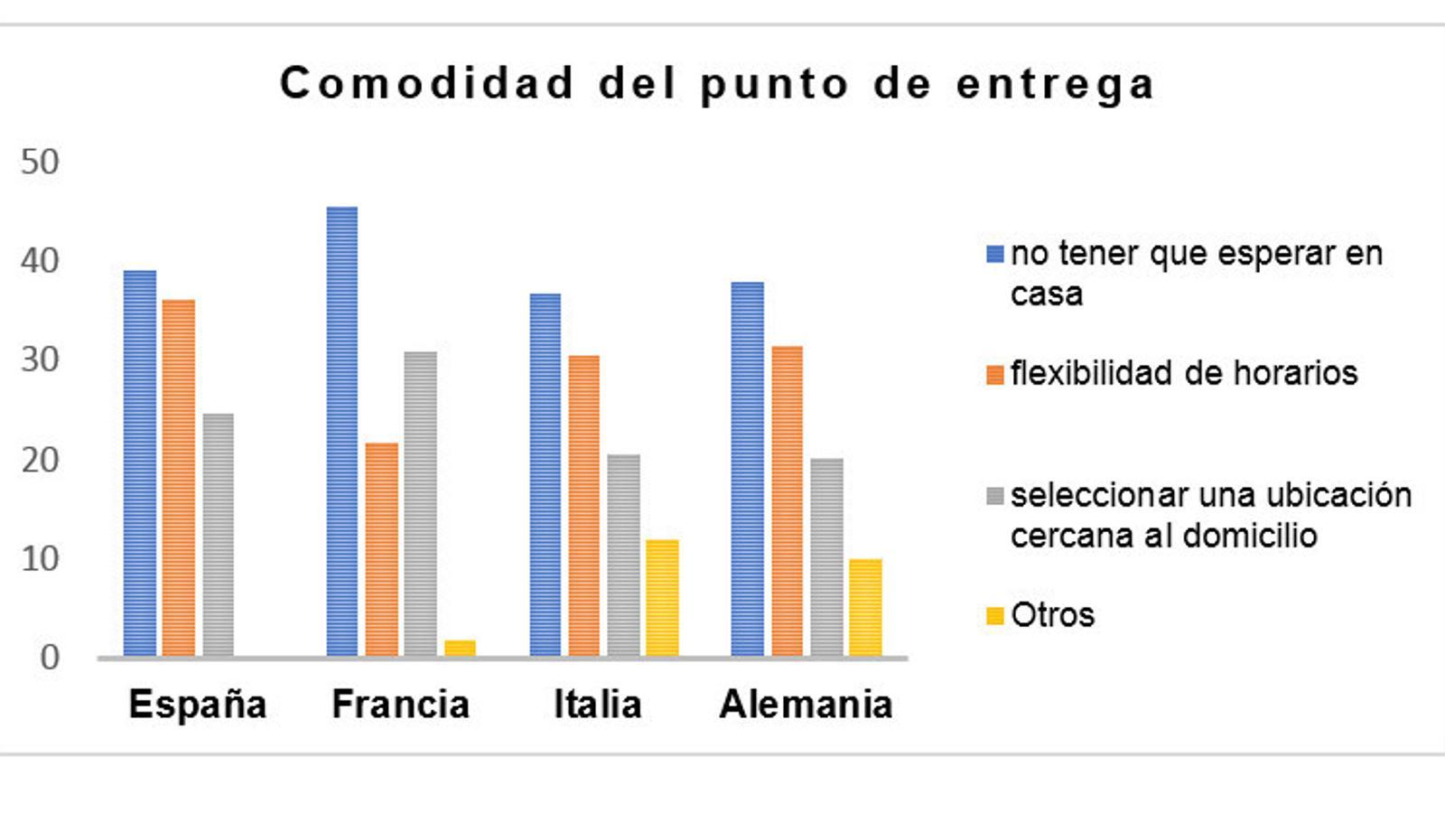Para todos los encuestados europeos, la principal ventaja de los puntos de conveniencia o 'drop off' es, precisamente, la comodidad de no tener que esperar en casa a que llegue el pedido. Así lo manifiestan el 39% de los españoles, el 45% de los franceses, el 37% de los italianos y el 38% de los alemanes.