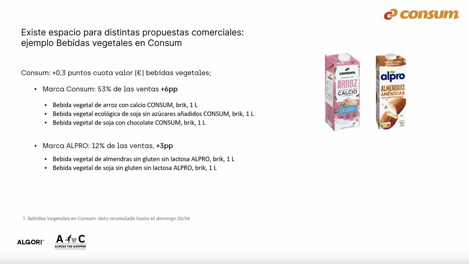 Uno de estos casos es el de las bebidas vegetales en Consum. En conjunto, la enseña valenciana ha ganado tres décimas en cuota valor en bebidas vegetales, lo que ha beneficiado tanto al distribuidor como al fabricante líder en esta categoría.
