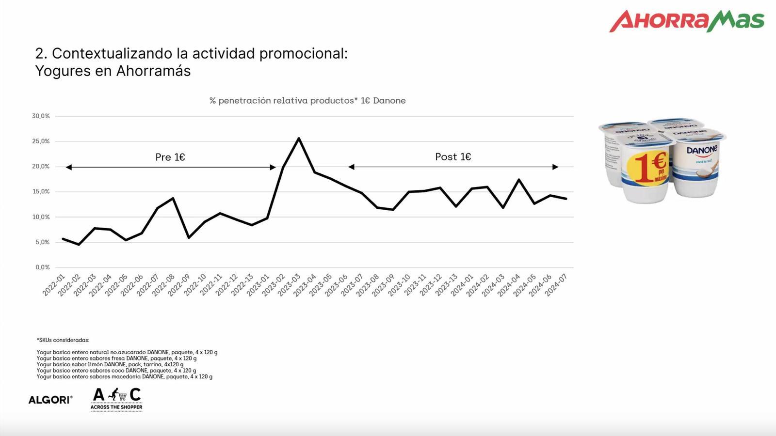 Así lo demuestra el caso de la promoción 'Danone a 1 euro' en Ahorramas, que no sólo ha tenido un efecto ascendente inmediato —le permitió superar el 25% de penetración entre febrero y marzo de 2023—, sino que le ha permitido consolidarse en torno a cinco puntos por encima en penetración desde su implantación hace cerca de año y medio.