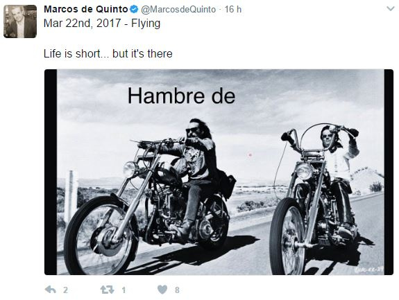 El anuncio del adiós de De Quinto pilló al directivo de viaje en Chile, tal y como se puede ver en su cuenta de Twitter. En uno de sus últimos mensajes publicados, se puede leer un ambiguo "Life is short... but it's there" ("La vida es corta, pero está ahí") con un fotograma de la película Easy Rider, todo un homenaje a la libertad.