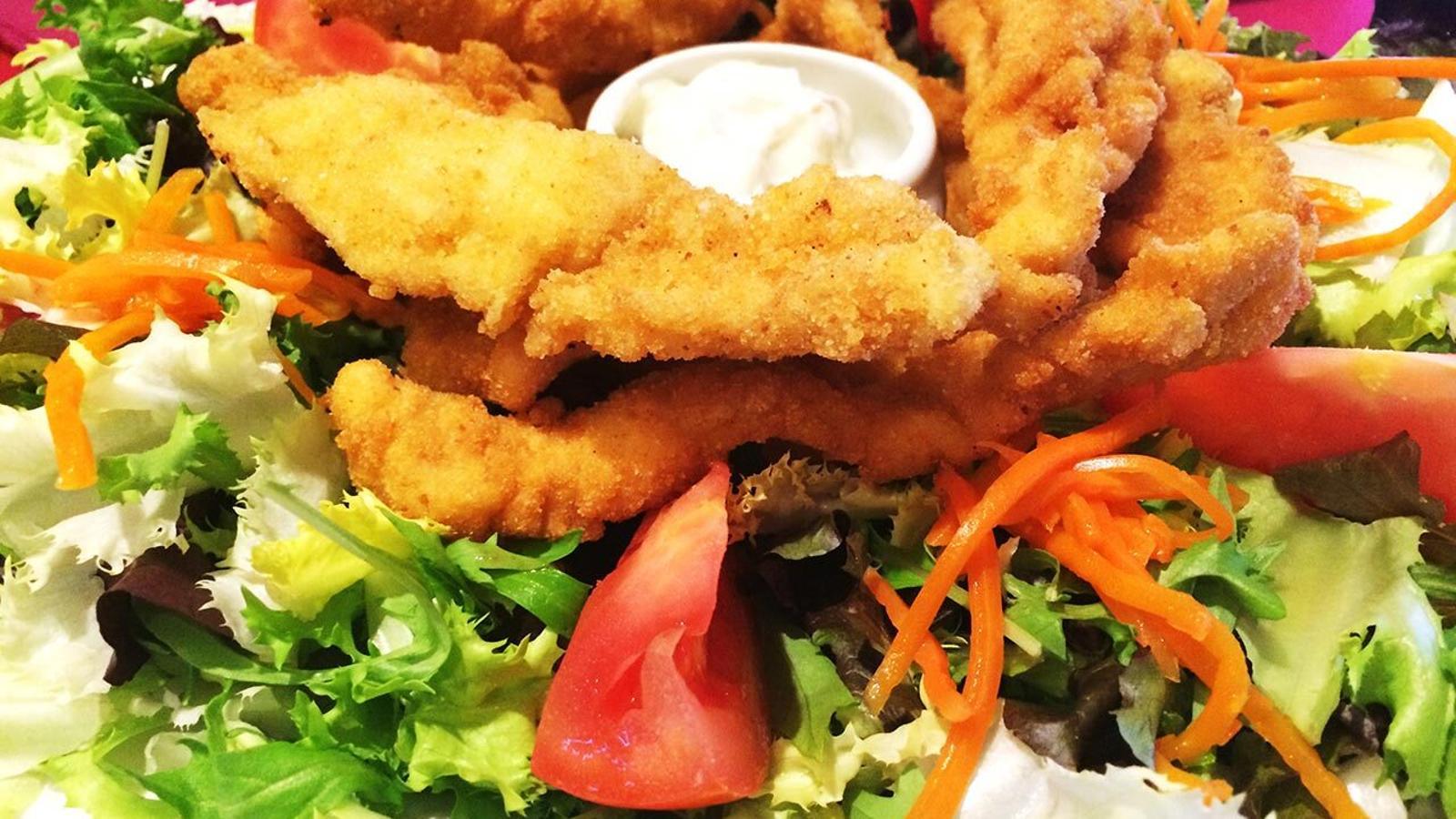 El acompañamiento también puede variar y, aunque lo habitual es incluir patatas fritas y pimientos del piquillo, se puede optar también por ensalada, champiñones, guarniciones de verduras, etc.
