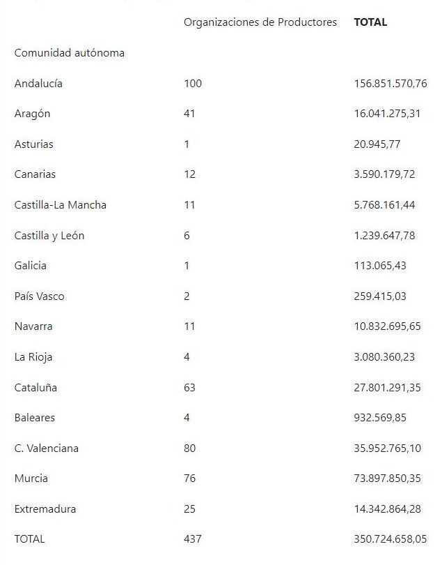 Las beneficiarias de estas ayudas serán 437 organizaciones de productores repartidas en 15 comunidades autónomas entre las que destacan, en términos de valor de producción comercializada y, en consecuencia, de ayuda solicitada, Andalucía, Murcia, Comunidad Valenciana, Cataluña, Aragón, Extremadura y Navarra, han precisado.