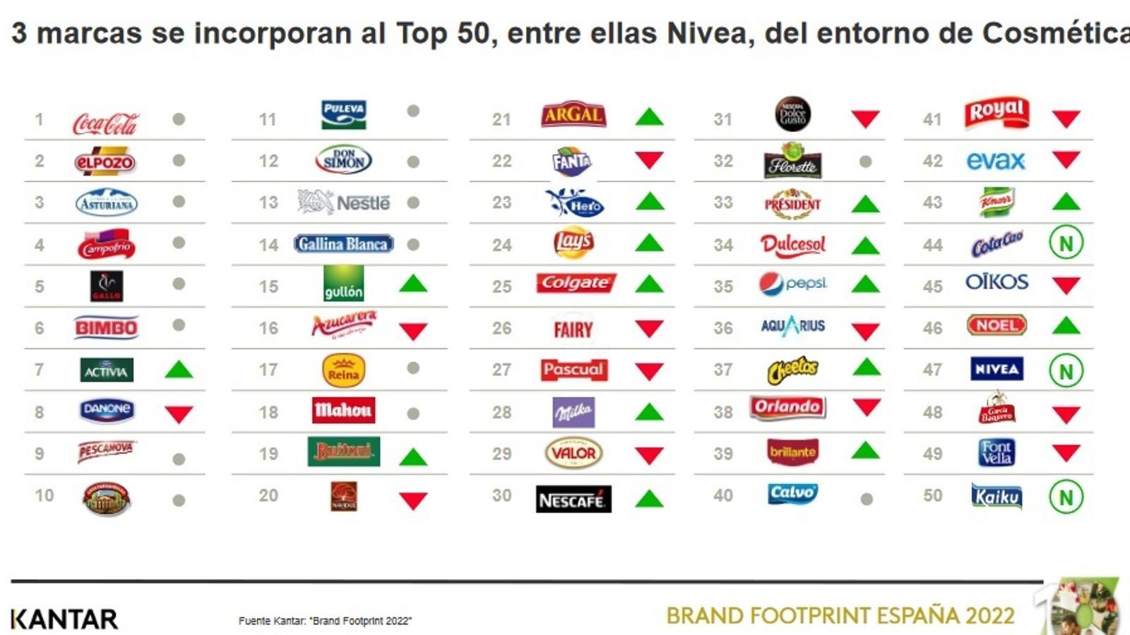 En cuanto al Top50, 7 de cada 10 marcas han cambiado su situación en el ranking, en el que destacan tres incorporaciones: ColaCao, Nivea y Kaiku. Con respecto al resto, 16 marcas han mejorado su posición, 15 han bajado y 16 se han mantenido. Para Jorge Folch, responsable del estudio, estos cambios son señal de que "el Gran Consumo es extremadamente competitivo".