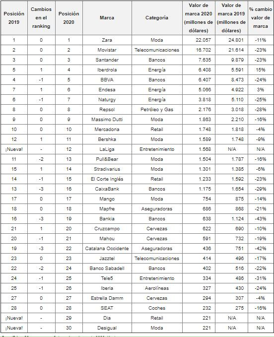 El Top30 español no muestra cambios en las tres primeras posiciones, con Zara (22.000 millones de dólares) como la marca más valiosa de España por tercer año consecutivo, seguida de Movistar (número 2, 16.700 millones de dólares) y Santander (número 3, 7.630 millones de dólares).