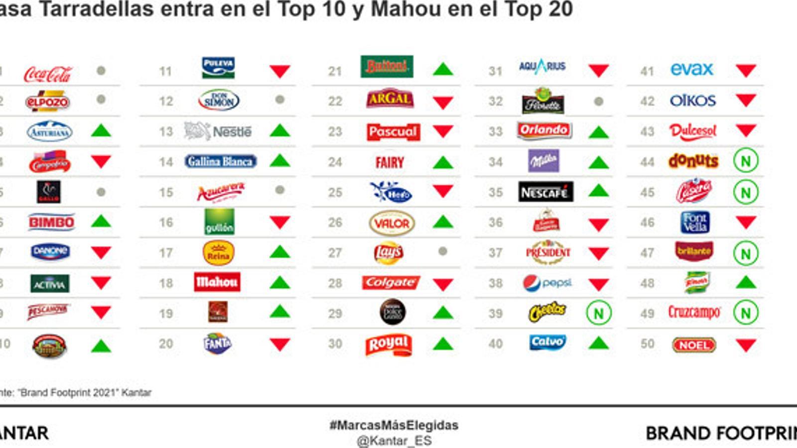 Por detrás de ellas se sitúan Campofrío, Gallo, Bimbo -que sube tres posiciones-, Danone, Activia, Pescanova y Casa Tarradellas, que se estrena en esta clasificación -en detrimento de Puleva- cerrando el Top 10. En cuanto al Top 20, destaca Kantar, es reseñable la entrada por primera vez de la cervecera Mahou, que se sitúa en el puesto 18 del ranking. En total, seis de las diez primeras marcas del Top 10 son españolas así como 29 del Top 50, también.