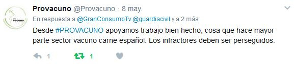 A través de su cuenta de Twitter, Provacuno se hizo eco de la información de GranConsumoTv señalando que "los infractores deben ser perseguidos". "Desde Provacuno apoyamos el trabajo bien hecho, cosa que hace la mayor parte del sector español de la carne de vacuno", añadía. También lanzaba a GranConsumoTv y a los medios de comunicación en general una petición especial: "Sería de agradecer titulares que no hagan general un problema aislado de una empresa concreta. No es representativo del sector".