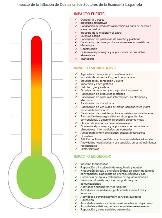 Otros sectores con impacto significativo por el alza de las materias primas y la energía son textil/confección y cuero, impresión y artes gráficas, industria química de consumo y otros productos, producción de productos metálicos, electrónica y material eléctrico, fabricación de muebles, actividades de edición y gestión de residuos.