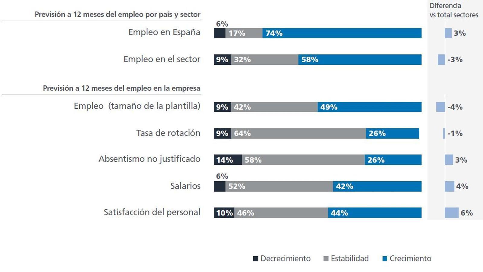 Aproximadamente la mitad de las empresas del sector alimentario prevé estabilidad respecto a los salarios (el 52%) y la satisfacción del personal (el 46%), mientras que cuatro de cada diez expertos del sector anticipan crecimientos tanto en el nivel de remuneración (el 42%) como en la satisfacción de su personal (el 44%), mostrando un optimismo más elevado que en el promedio de todos los sectores.