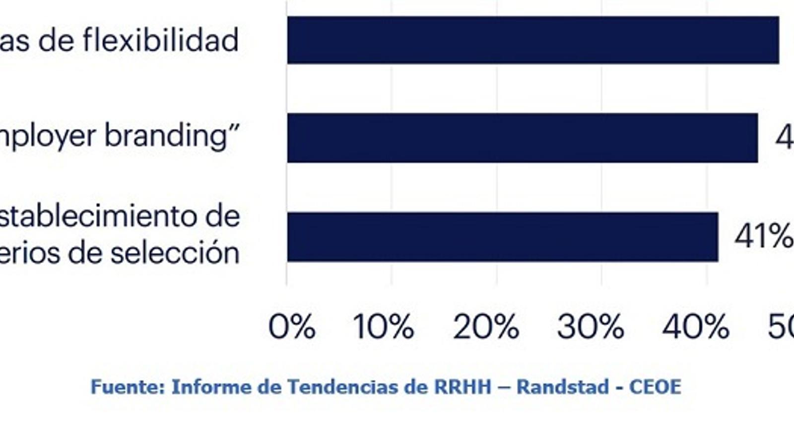 En cuanto a las estrategias para afrontar el déficit de talento, las compañías apuestan mayoritariamente por las políticas de flexibilidad (47%), el employer branding (45%) y el restablecimiento de los criterios de selección (41%). Entre las medidas de flexibilidad más populares se encuentran poder elegir el horario de entrada, contar con unas vacaciones flexibles, el teletrabajo y la jornada intensiva.