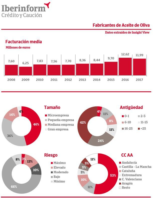 Desde el inicio de la crisis, la facturación media de los fabricantes de aceite de oliva se ha duplicado hasta alcanzar los 12 millones de euros. Los márgenes, sin embargo, son ajustados y el signo de los resultados presenta grandes oscilaciones de año en año. En ese contexto, el 13% de estos fabricantes está en riesgo elevado de incumplir sus pagos. El riesgo es máximo en el 3% del sector, según datos de Insight View.
