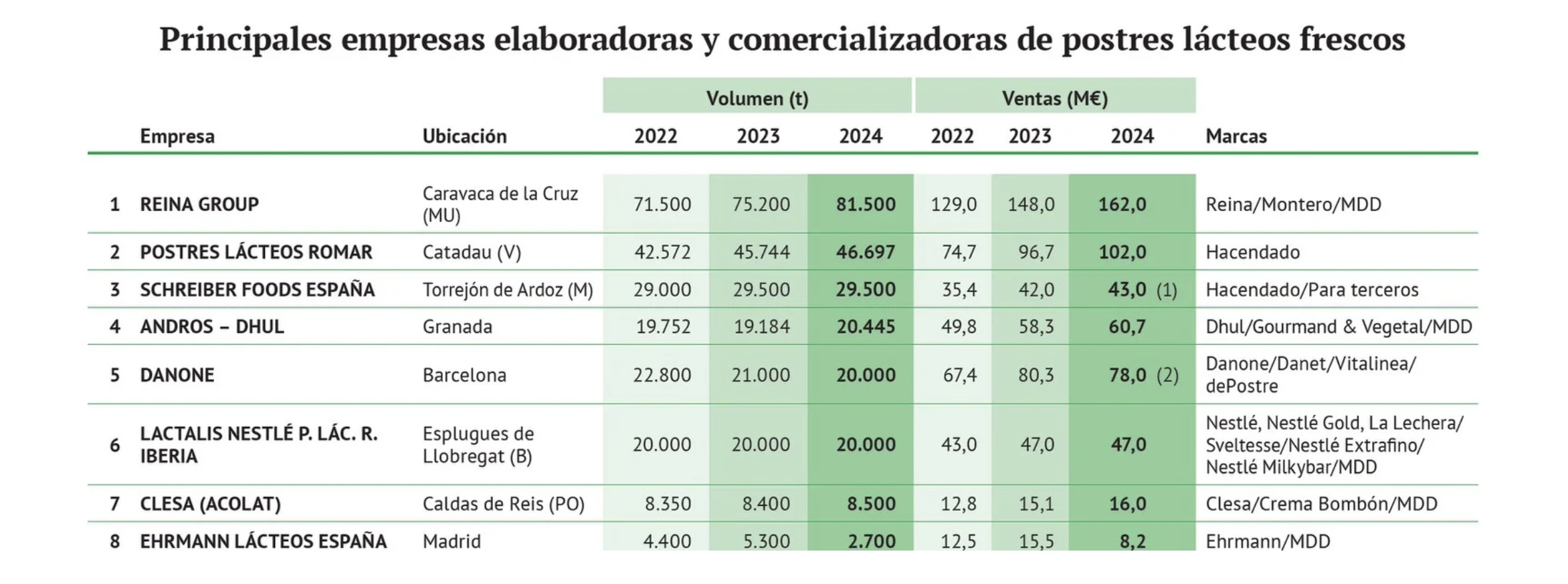 De acuerdo a los datos proporcionados por la empresa (ver tabla abajo), los resultados del presente curso consolidan a Reina como el principal fabricante de postres lácteos, por encima de los dos proveedores de Hacendado, Romar y Schreiber, y de otras marcas reconocidas como Dhul y Danone.