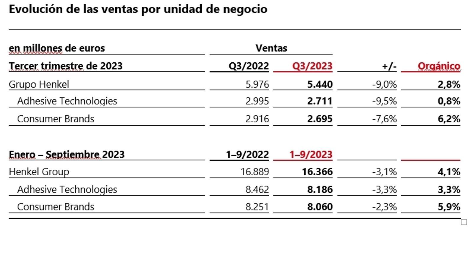 Las ventas en los nueve primeros meses de 2023 han alcanzado los 16.366 millones de euros, lo que representa un descenso nominal del -3,1%. Orgánicamente, Henkel ha registrado un crecimiento muy fuerte de las ventas del 4,1%, impulsado por un aumento de dos dígitos en los precios.