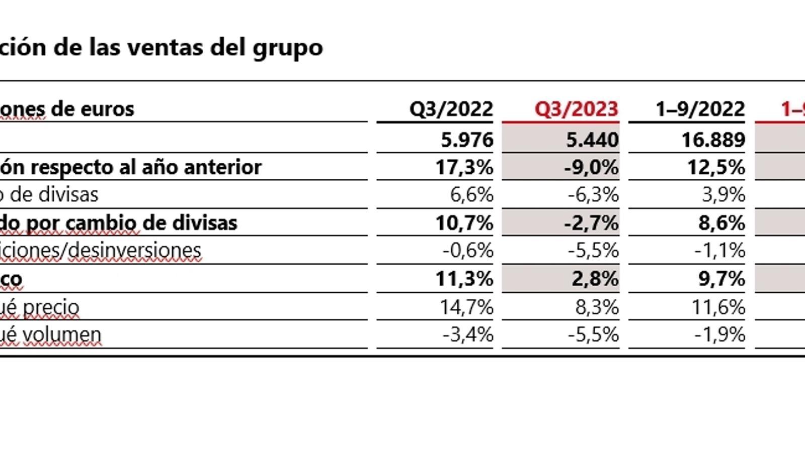 Las ventas del grupo en el tercer trimestre de 2023 han alcanzado los 5.440 millones de euros, lo que supone un descenso nominal del -9,0% en comparación con el trimestre del año anterior. Los efectos de las adquisiciones y desinversiones -incluido el impacto de la venta del negocio en Rusia- han reducido las ventas en un -5,5%. Los efectos del tipo de cambio también han afectado negativamente a la evolución de las ventas en un -6,3%.