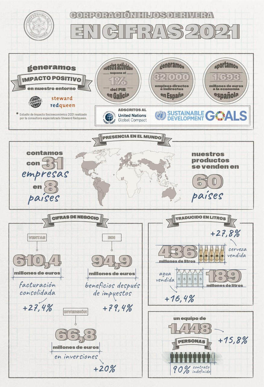 En la presentación se dieron a conocer los resultados del informe de Impacto Socioeconómico de Corporación Hijos de Rivera en 2021, que realiza la consultora independiente Steward Redqueen, y que señala que la actividad de la compañía supone ya el 0,14% del PIB nacional y que genera más de 32.000 empleos directos e indirectos en nuestro país. En 2021, la compañía ha contribuido con 1.693 millones de euros a la economía española.